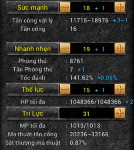 ● Tăng Sức Mạnh là chính, tăng Nhanh Nhẹn là phụ: Cách cộng điểm này giúp Dark Knight tối đa hóa sát thương, trở thành nỗi ác mộng cho những kẻ địch máu giấy trong PK. Với mỗi cấp độ, Mutizen sẽ nhận được điểm thuộc tính để phân bổ, và cách cộng thường thấy là 4 điểm Tấn Công và 1 điểm Nhanh Nhẹn.