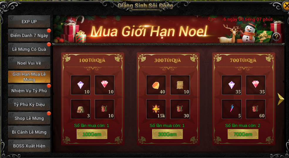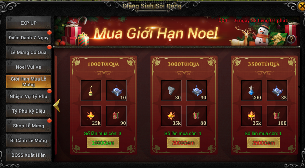 Nội dung: Dùng Gem để mua các gói quà hạn giờ và giới hạn số lượng.