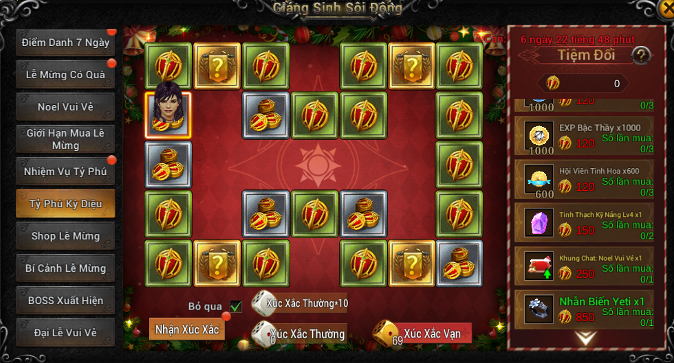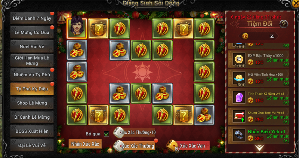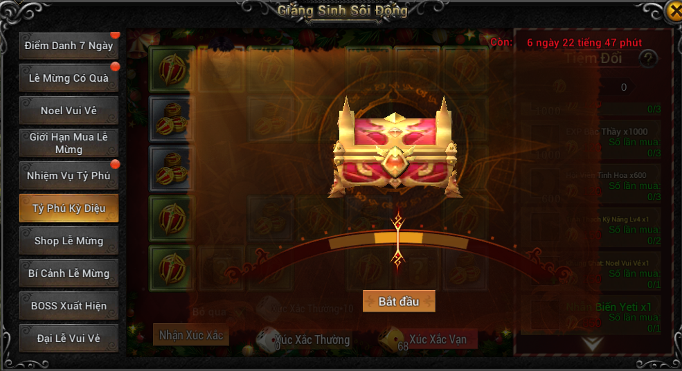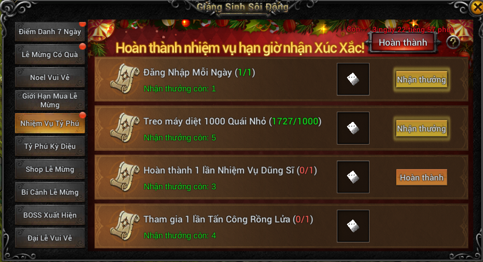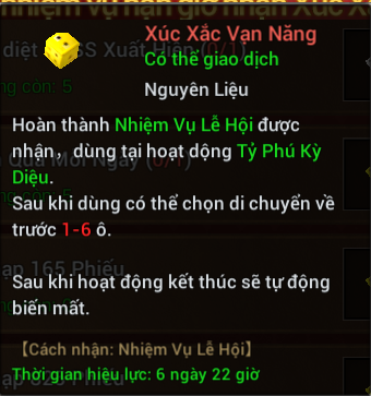 Nội dung: Hoàn thành các nhiệm vụ của trò chơi để nhận được thưởng Xúc Xắc, Xúc Xắc dùng cho hoạt động Tỷ Phú Kỳ Diệu ở mục số 11.
