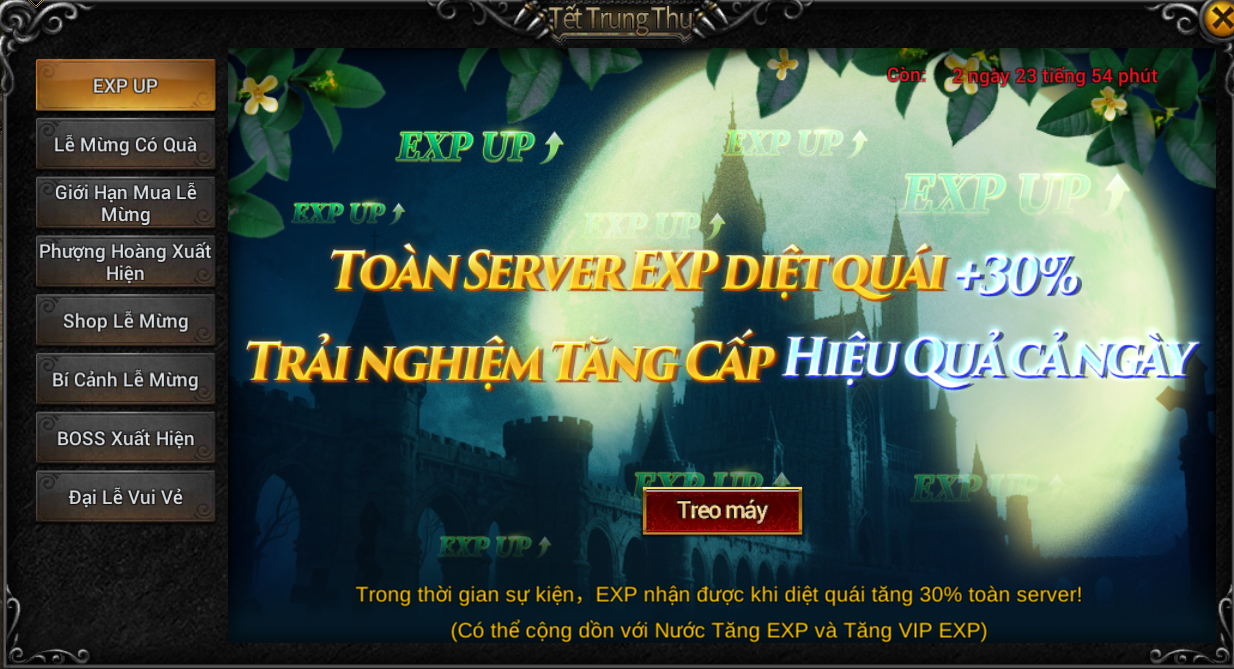 Nội dung: Trong thời gian diễn ra sự kiện, EXP nhận được khi diệt quái, boss tăng lên 30% toàn Server (không áp dụng cho các Boss đặc biệt và các vật phẩm rơi ra EXP )