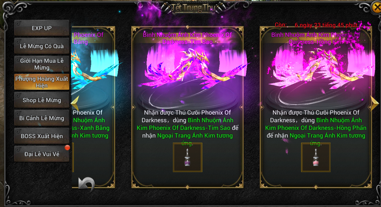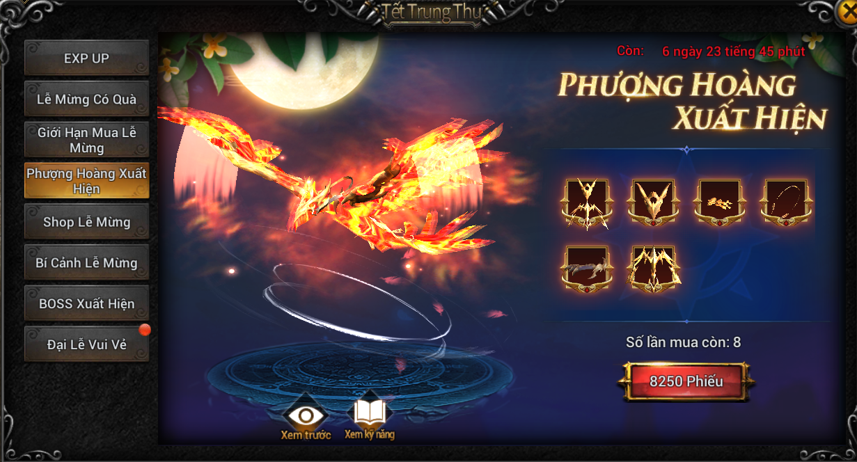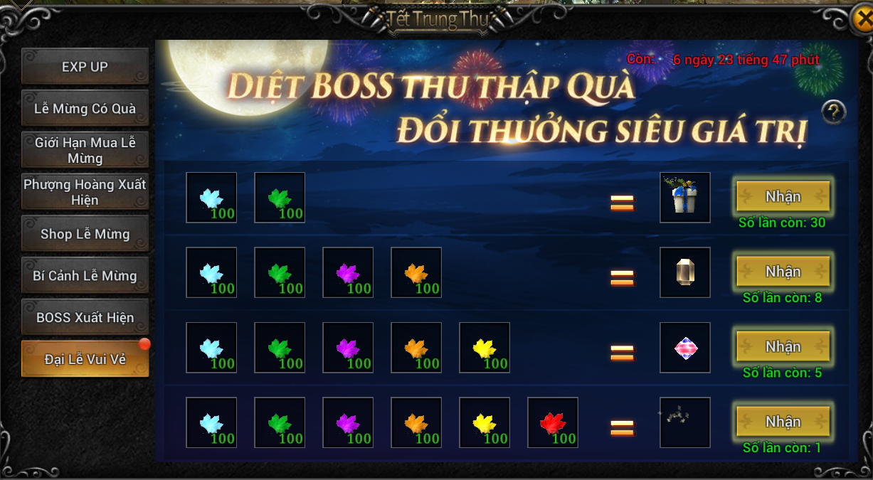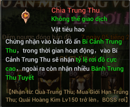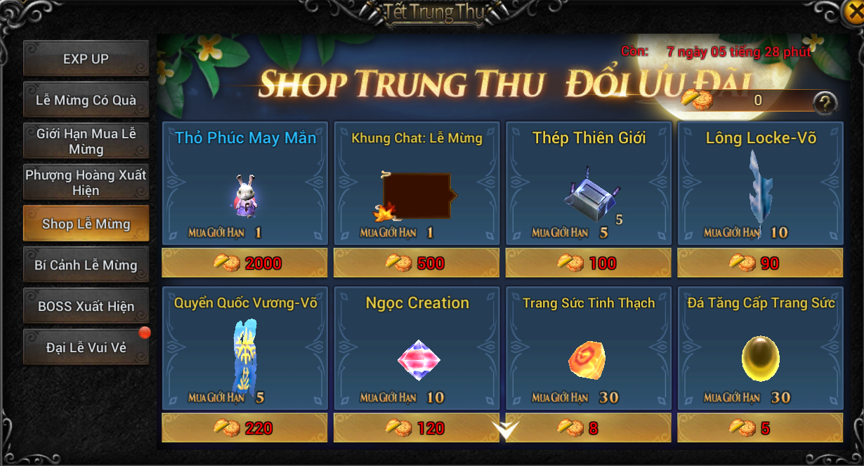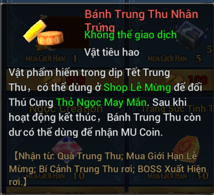 Nội dung: Sử dụng vật phẩm Bánh Trung Thu Nhân Trứng để đổi thưởng giới hạn.