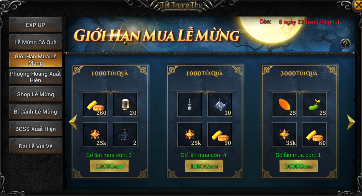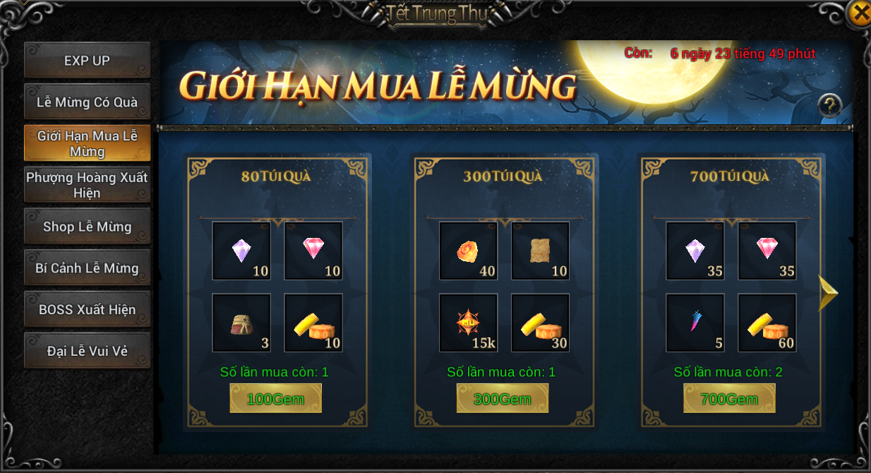 Nội dung: Dùng Gem để mua các gói quà hạn giờ và giới hạn số lượng.