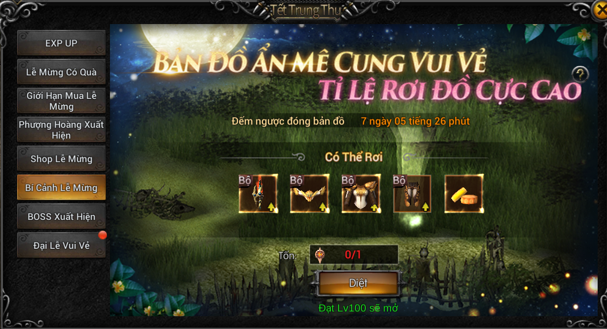 Nội dung: Farm các Boss và Quái Hoàng Kim (Tinh Anh) rơi ra các vật phẩm, thu thập các vật phẩm để đổi thưởng, tỉ lệ rơi ra vật phẩm phụ thuộc vào giá trị của thưởng, vật phẩm nguyên liệu để đổi thưởng giá trị thì tỉ lệ rơi ra càng thấp.