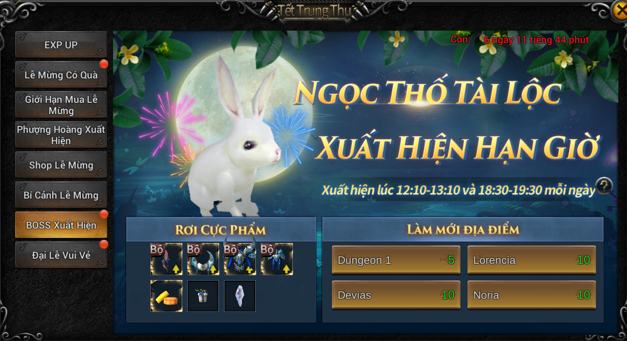 Nội dung: Các Boss Ngọc Thố Tài Lộc xuất hiện trong khoảng thời gian cố định ở các vị trí ngẫu nhiên trong bản đồ chỉ định (tương tự như Rồng Đỏ). Thỏ Ngọc sẽ có số lượng 10 con và dễ săn hơn Boss.