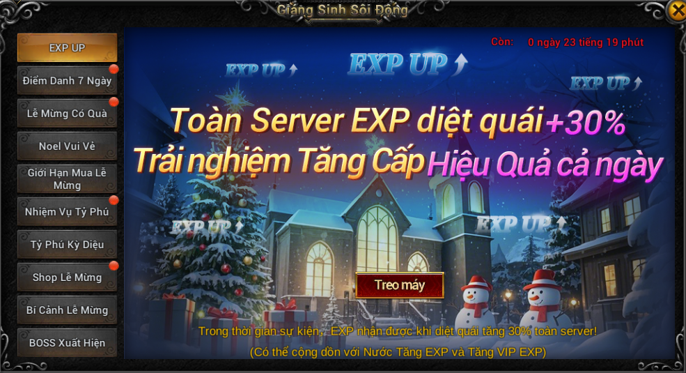 Nội dung: Trong thời gian diễn ra sự kiện, EXP nhận được khi diệt quái, boss tăng lên 30% toàn Server (không áp dụng cho các Boss đặc biệt và các vật phẩm rơi ra EXP )