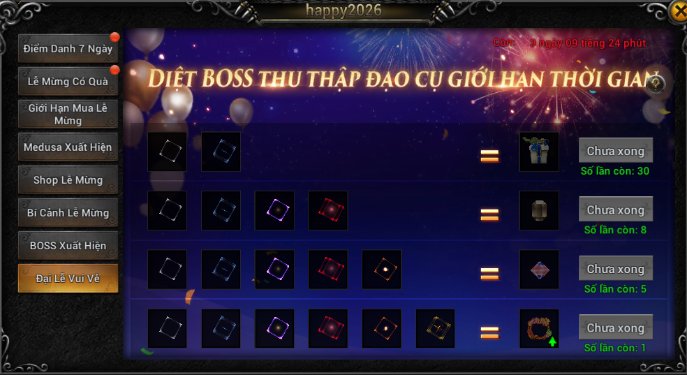 Nội dung: Farm các Boss và Quái Hoàng Kim (Tinh Anh) rơi ra các vật phẩm, thu thập các vật phẩm để đổi thưởng, tỉ lệ rơi ra vật phẩm phụ thuộc vào giá trị của thưởng, vật phẩm nguyên liệu để đổi thưởng giá trị thì tỉ lệ rơi ra càng thấp.
