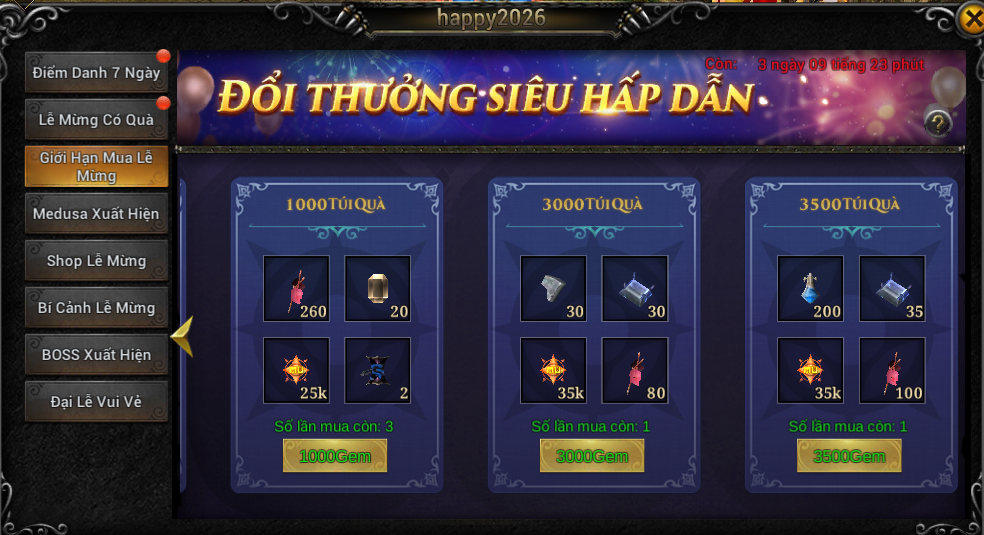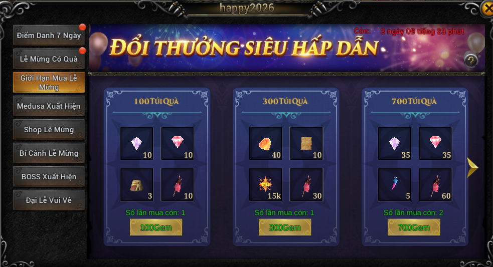 Nội dung: Dùng Gem để mua các gói quà hạn giờ và giới hạn số lượng.