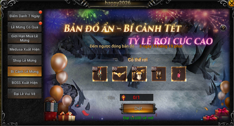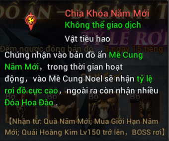 Nội dung: Sử dụng chìa khóa đặc biệt để vào Bí Cảnh Lễ Mừng.