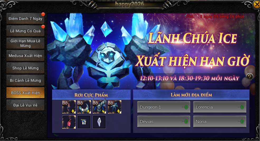 Nội dung: Các BOSS sự kiện sẽ xuất hiện ngẫu nhiên trong các bản đồ chỉ định trong khung giờ đặc biệt, tiêu diệt các Boss để nhận thưởng, số lượng nhận được thưởng mỗi ngày của mỗi nhân vật sẽ có giới hạn.
