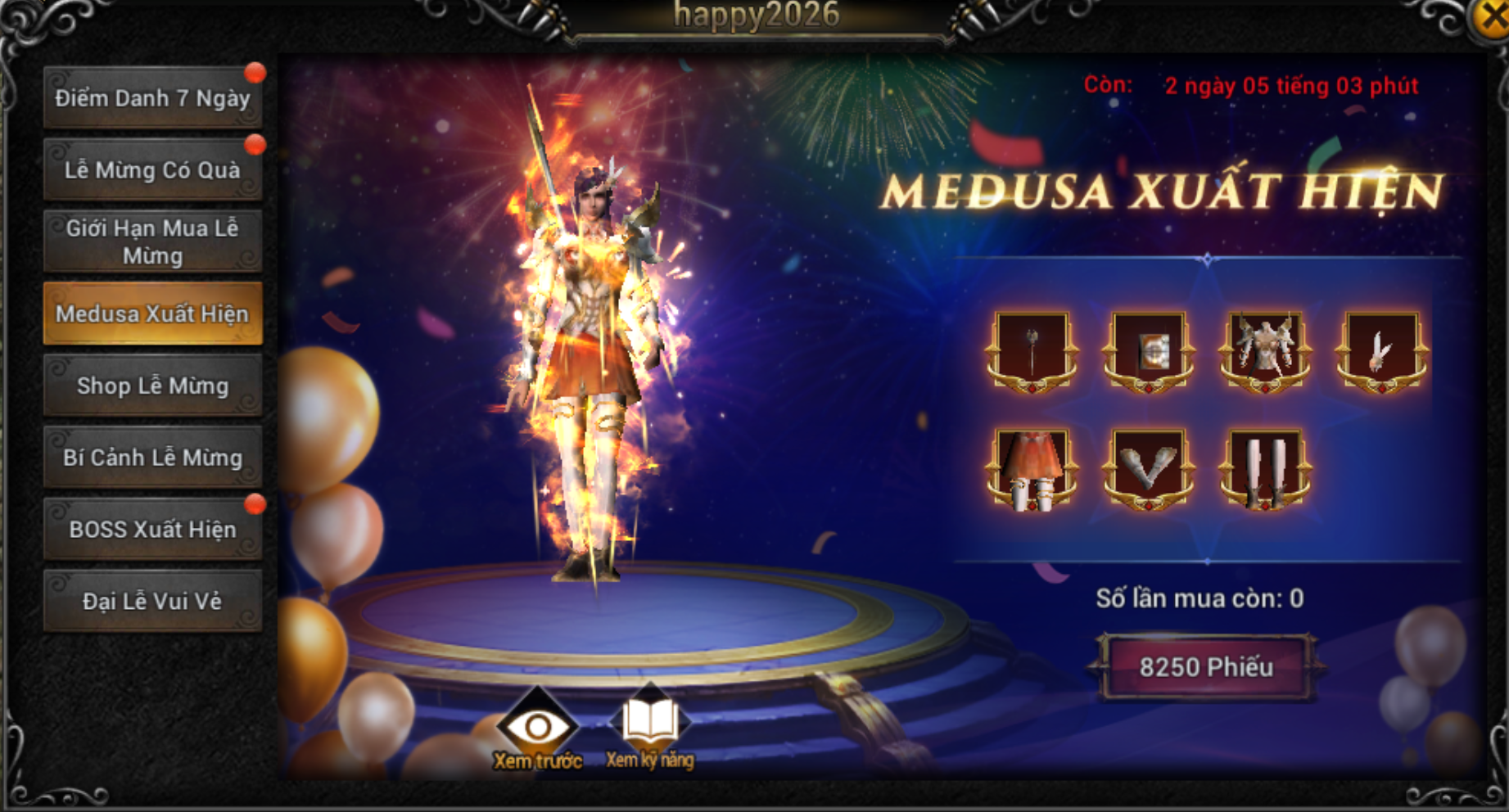 Nội dung: Sử dụng Phiếu để mua lại gói Skin Medusa – Vật Phẩm nhuộm cũng được bán lại trong Shop Lễ Mừng.