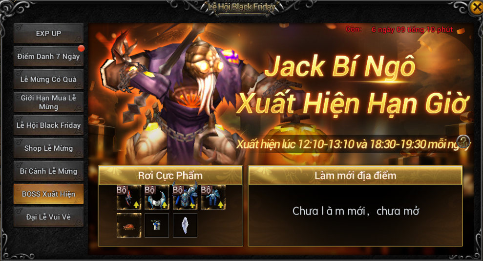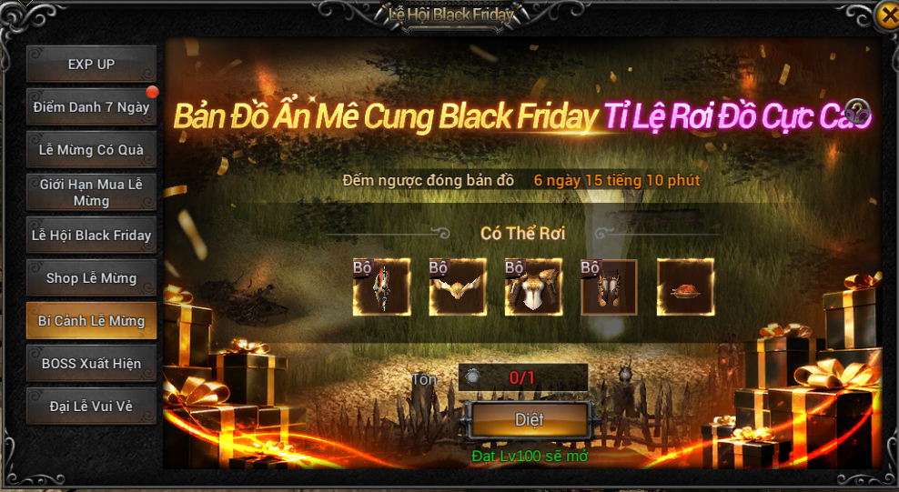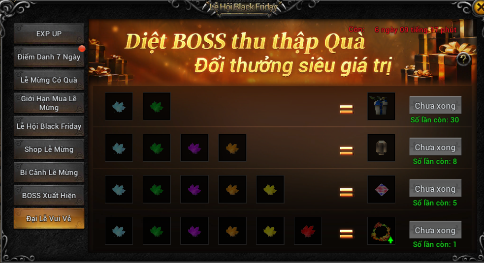 Nội dung: Farm các Boss và Quái Hoàng Kim (Tinh Anh) rơi ra các vật phẩm, thu thập các vật phẩm để đổi thưởng, tỉ lệ rơi ra vật phẩm phụ thuộc vào giá trị của thưởng, vật phẩm nguyên liệu để đổi thưởng giá trị thì tỉ lệ rơi ra càng thấp.