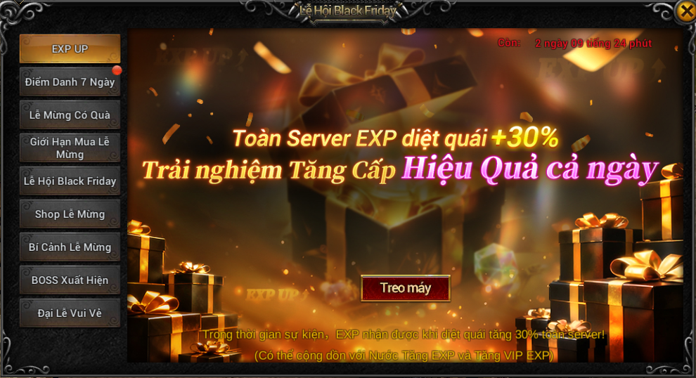 Nội dung: Trong thời gian diễn ra sự kiện, EXP nhận được khi diệt quái, boss tăng lên 30% toàn Server (không áp dụng cho các Boss đặc biệt và các vật phẩm rơi ra EXP )