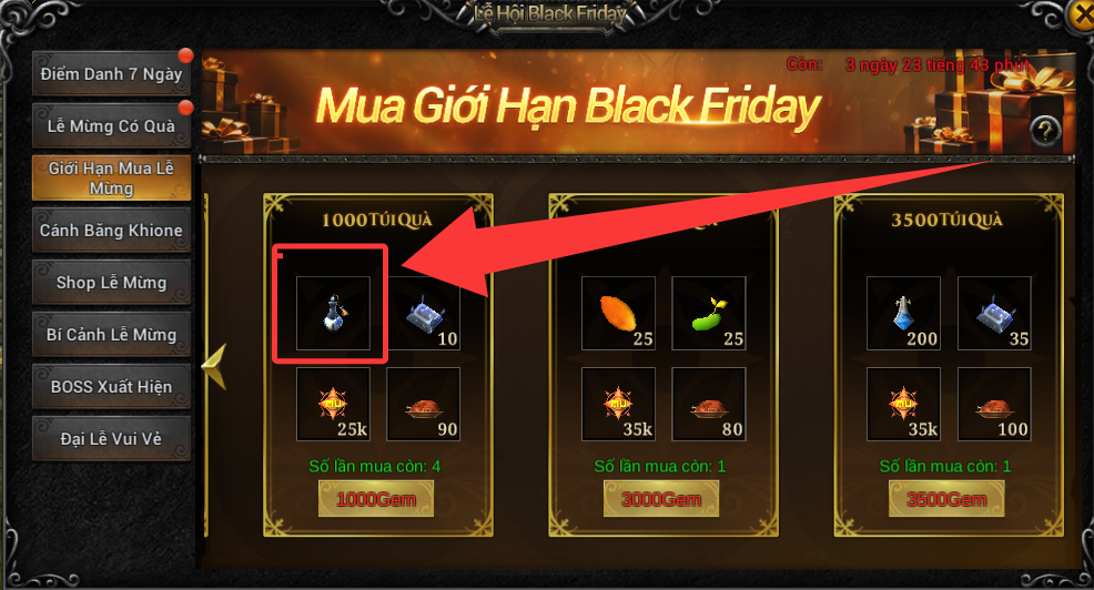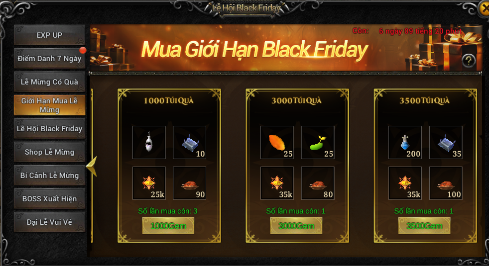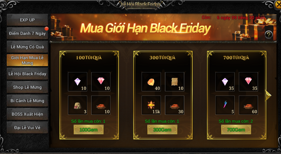 Nội dung: Dùng Gem để mua các gói quà hạn giờ và giới hạn số lượng.