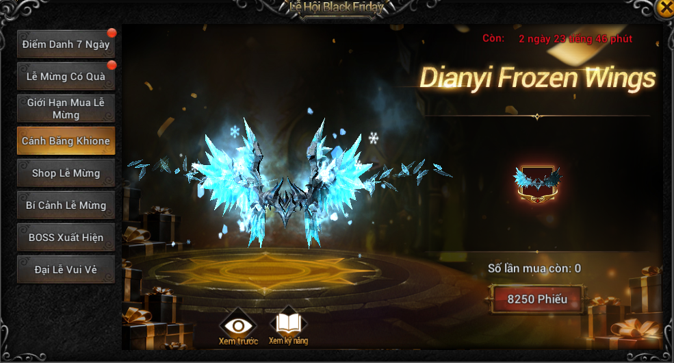 Nội dung: Sử dụng Phiếu để mua lại gói Skin Cánh Băng Khione – Vật Phẩm nhuộm cũng được bán lại trong Shop Lễ Mừng.