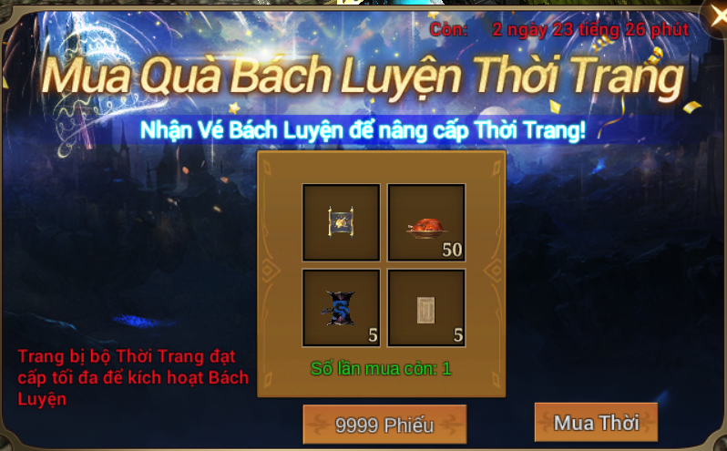 Nội dung: Mở bán vật phẩm Vé Bách Luyện Thời Trang.