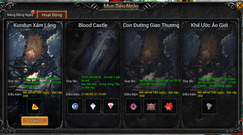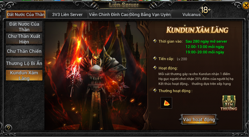 Nội dung hoạt động: Khi bắt đầu thời gian hoạt động, bấm vào Vào Hoạt Động ở mục Kundun Xâm Lăng hoặc mục tương tự trong tab Hoạt Động Hằng Ngày.