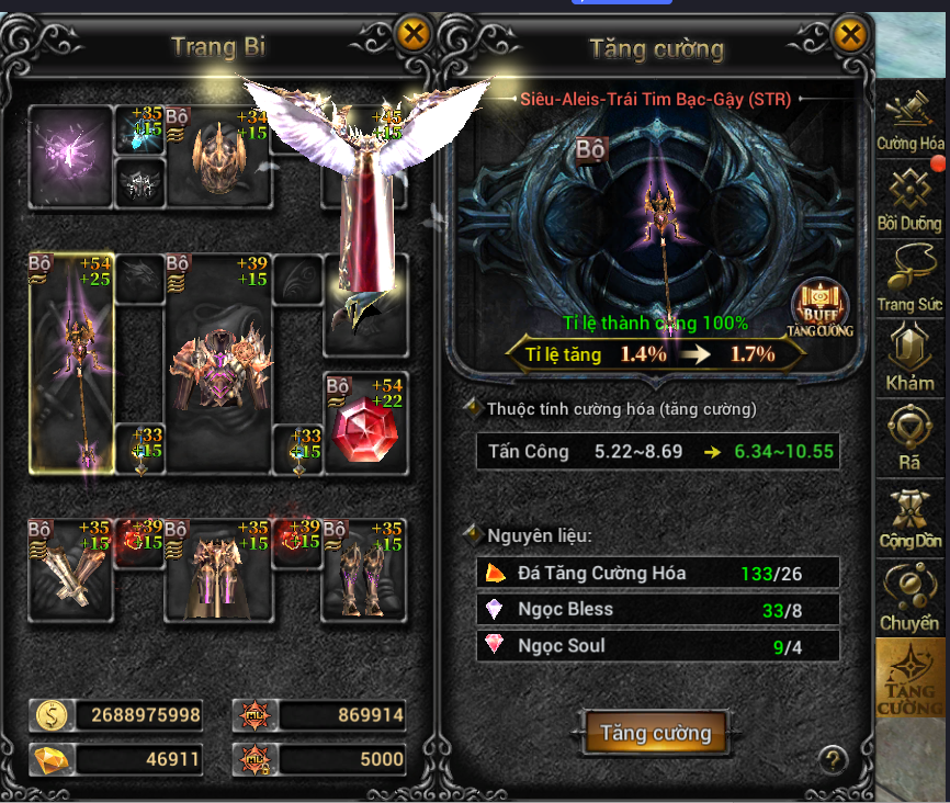 Tỉ lệ tăng càng cao, thuộc tính tăng cường càng lớn và tỉ lệ thành công sẽ giảm xuống.