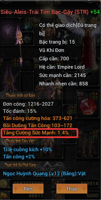 Sau khi được tăng cường Cường Hóa sẽ xuất hiện dòng như trên trong thông tin trang bị được Tăng Cường Cường Hóa.