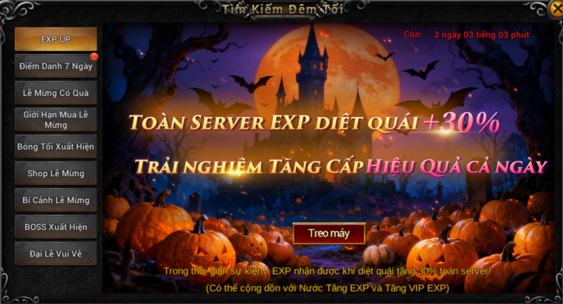 Nội dung: Trong thời gian diễn ra sự kiện, EXP nhận được khi diệt quái, boss tăng lên 30% toàn Server (không áp dụng cho các Boss đặc biệt và các vật phẩm rơi ra EXP )