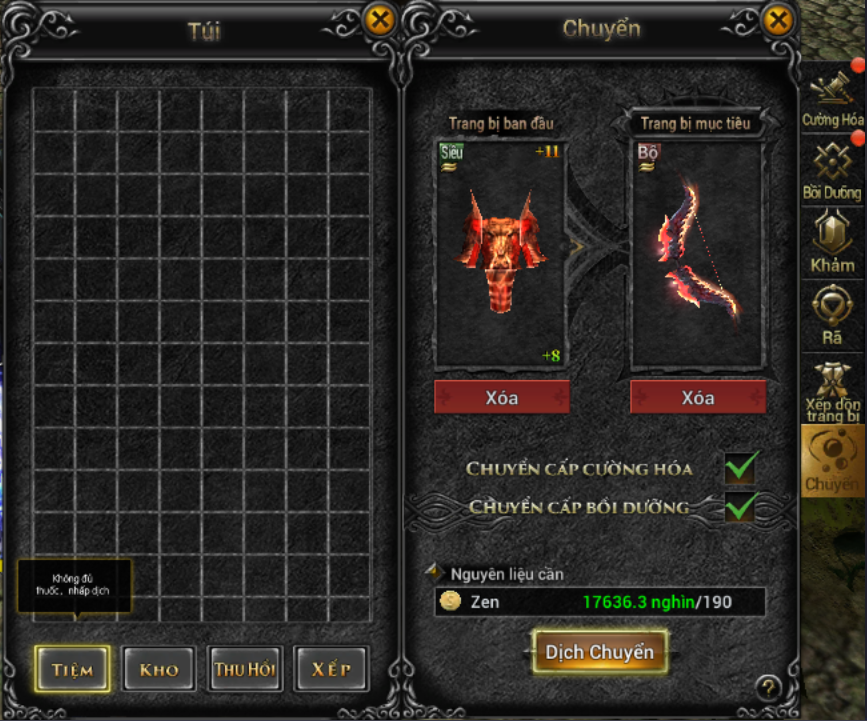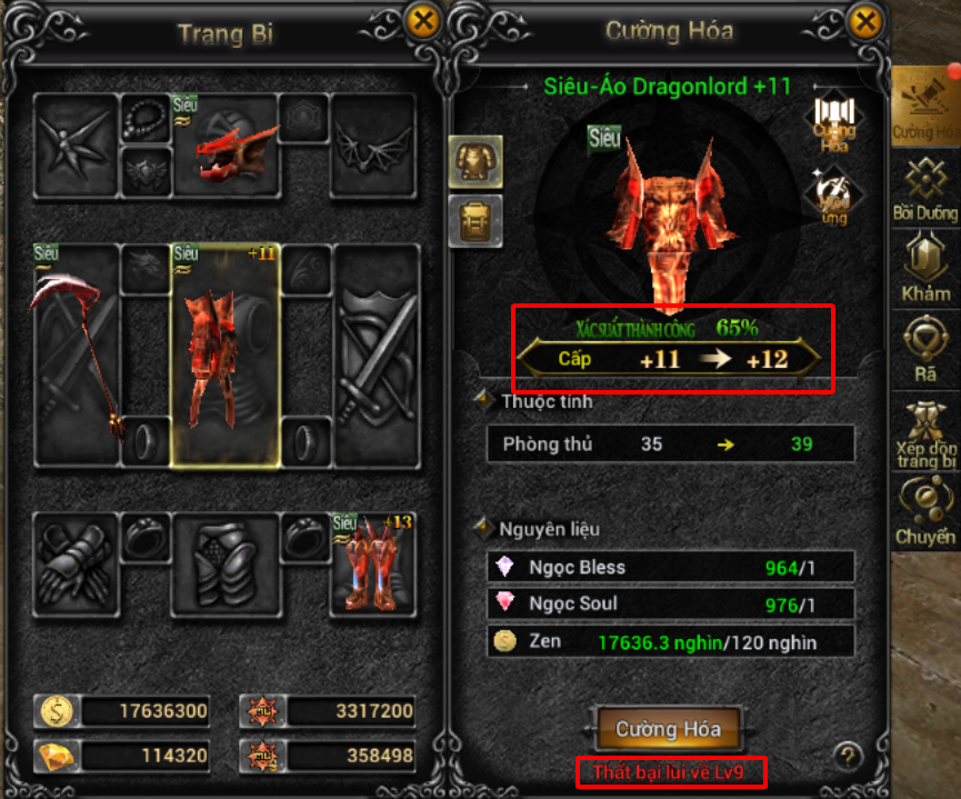 Cường hóa trang bị cần tiêu hao Ngọc Bless, trang bị cấp cao hơn cần tiêu hao thêm Ngọc Soul và Ngọc Chaos. Ngọc Bless và Ngọc Soul trong MU Lục Địa VNG thuộc tài nguyên chiến lược, vô cùng khó kiếm, vì vậy mỗi lần cường hóa đều là vô cùng quý giá.