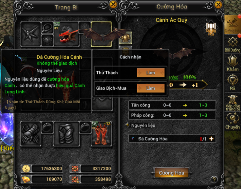 Vũ khí, cánh, dây chuyền, nhẫn những trang bị này khi cường hóa sẽ tăng lực tấn công.